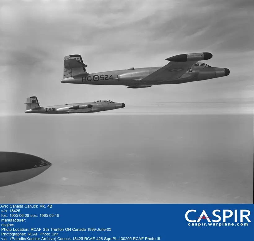 First Canuck to fly with Orenda engines, on 20 June 1951. Also first armed Canuck. Fitted with metal nose cone during gun and rocket firing trials. Formally taken on RCAF charge on 2 September 1952. Used by Avro Canada for engine and armament development work in early 1950s. Trials included all weather and anti-icing tests in spring of 1953. Fitted with US built T-160 20mm cannon, for firing trials from May 1954 to April 1955. Many of these tests flown by Avro Canada pilot Peter Cope.last update: 2026-January-15