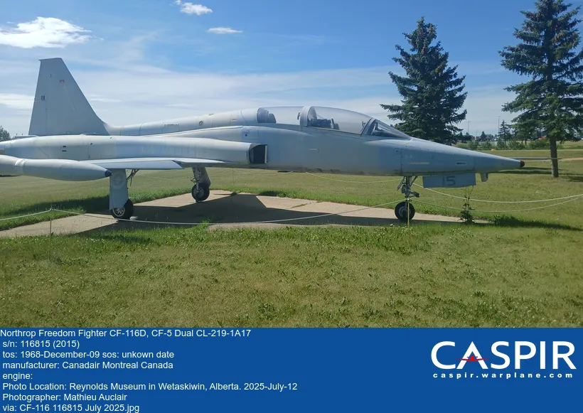 Originally ordered as RCAF 14707, re-marked before completion. Initial delivery to CFB Cold Lake, Alberta, left Cartierville on 27 October, arrived 29 October 1969. First single seater delivered to Cold Lake. Delivery pilot was Capt. Jake Miller, later to be 434 Squadron solo demo pilot for 1970 to 1974. With No. 434 Squadron at Cold Lake in 1973 and 1977. Stored at CFB Trenton c.1982 to 1985. Back to 434 Squadron at CFB Chatham, NB in 1986. With No. 419 Squadron at Cold Lake in 1988 and 1989. Received full Avionic Update Program modifications in early 1990s. In use with Aerospace Engineering Test Establishment at CFB Cold Lake, Alberta in August 1994, and in February 1995, one of the last operational CF-5s. Stored at Mountain View by 1996. Seen in storage, inside Hanger 1 at CFD Mountain View, Ontario in October 2005. Transported to Calgary in early 2006, reported destined for a local museum. Publicly unveiled in June 2007, on pedestal at Museum of the Regiments, in Calgary. Still there in 2010.last update: 2025-November-19