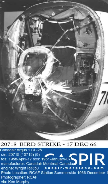 First assigned to Argus Conversion Unit (a detachment of 2 (M) Operational Training Unit) at RCAF Station Greenwood, NS on 18 April 1958. Nose cone damaged by bird strike on 17 December 1966 while with 415 (MP) Squadron. With 407 (MP) Squadron at RCAF Station Comox, BC after Integration but before renumbering.From 10718