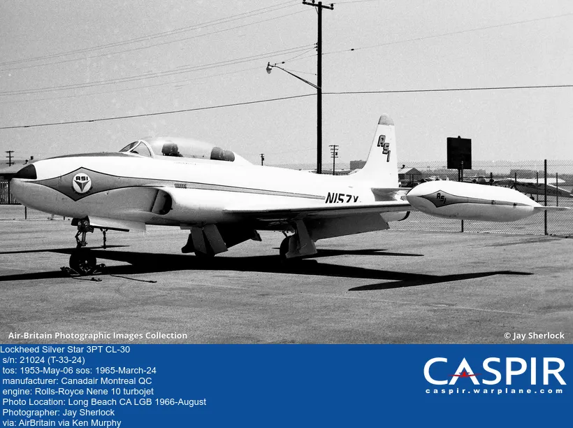 The Canadair CT-133 was the result of a 1951 contract to build T-33 Shooting Star trainers for the Royal Canadian Air Force (RCAF). The powerplant is a Rolls-Royce Nene 10 turbojet instead of the Allison J33 used by Lockheed in the production of the original T-33. A project designation of CL-30 was given by Canadair and the name was changed to Silver Star. The appearance of the CT-133 is very distinctive due to the large fuel tanks usually carried on each wingtip. A total of 656 CT-133 aircraft were built by Canadair.