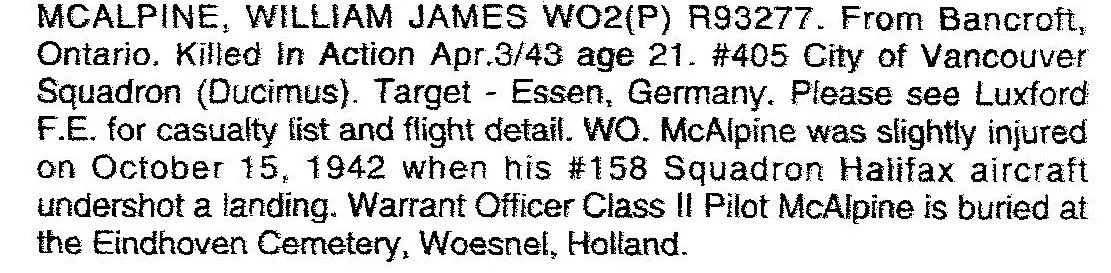 Halifax DT808 served with No. 405 (B) Squadron, RCAF, coded "LQ*V". Failed to return from the attack on Essen on 3 / 4 April 1943, shot down by a night fighter flown of I./NJG1. Crashed near "Lijnbraak" farmhouse, Vierlingsbeek, the Netherlands. 5 crew were killed and 2 POW.