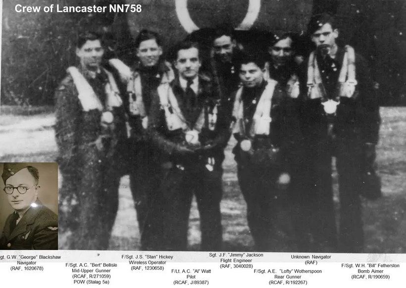 Flight Lieutenant Alastair Clarence Watt (RCAF), Flight Sergeant William Henry Fetherston (RCAF), Pilot Officer Albert Edward Wotherspoon (RCAF), Flight Sergeant George William Blackshaw (RAFVR), Flight Sergeant James Stanley Hickey (RAFVR) and Sergeant James Frederick Jackson (RAFVR) were all killed in action