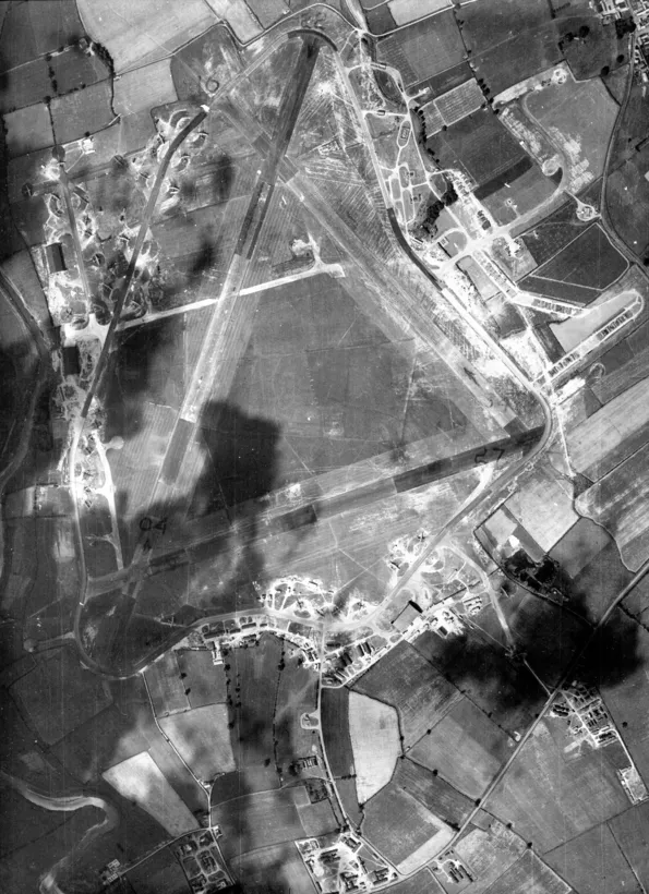 The following day, May 8, he wrote, 'We got airborne at 10:30am . . . The day was very warm & bright & I enjoyed the trip from the nose of the aircraft in the bomb aimers position where I could see all there was to see. . . we passed over close to Antwerp, circled Brussels and finally found our aerodrome B58 at a little town called Melsbroek . . .. This aerodrome was one of the ones camouflaged by the Jerry to look like a village. The flying control building looked like a school house complete with tower and bell. The area was laid out in streets with what resembled houses & stores along both sides. However, on closer inspection the buildings were all shells housing hangers, workshops, garages and billets etc. The fronts were of wood & all painted to represent windows, doors, signs etc. but actually were big doors which opened out when in use. It sure looked like a lot of work for what they got out of it. We also saw a building which had a big sign POW lettered on top of it but which actually held petrol and oil stores . . .'