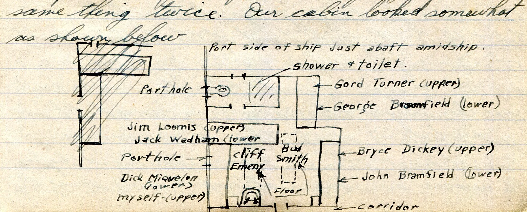 'It is not too bad except for lack of space to store luggage and move around in . . . also rigged up ropes all over the place for hanging up clothes etc.' To add to the general discomfort, they were under strict orders to sleep in their clothes while on board so Ross did not change some of his clothes for the next 10 days.