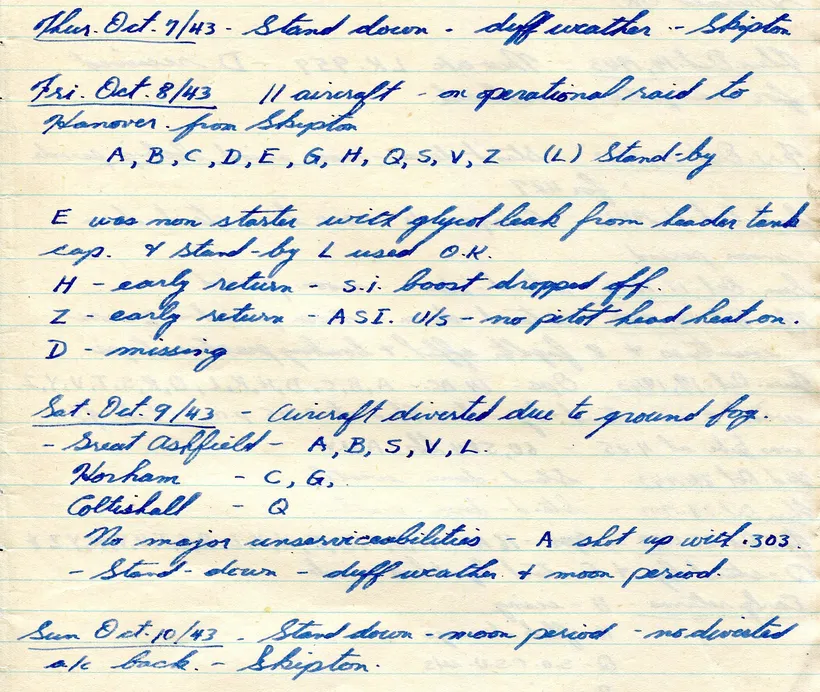 This is a summary of the story A. Ross Dawson tells in his wartime diary, supplemented by technical material he retained, and family records. It has been prepared by his son W.R. (Bill) Dawson in January 2024. In the first week of arriving at his first UK posting at Leeming, Yorkshire, Ross began to refer to their aircraft as 'kites' and did so consistently throughout the remainder of his time overseas.