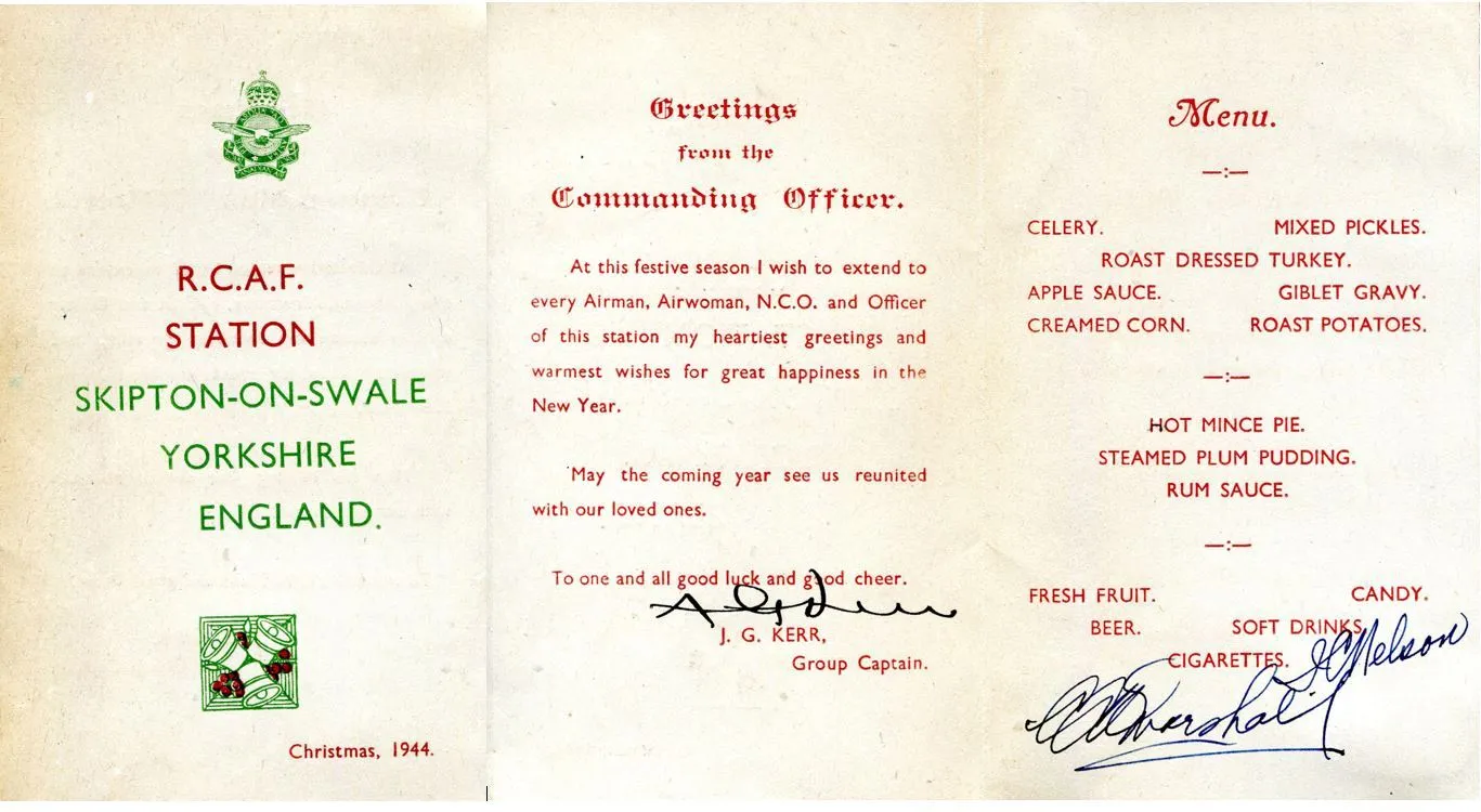 There was some relief on Christmas Day 'When word came through that there were no ops this morning I gave all my boys a stand-down & then gave myself a Christmas present & slept until noon. . . went to a nice turkey dinner with all the trimmings including plum pudding with rum sauce, It was very good too although not quite the same as being able to carve off as much turkey for myself as I wanted. At night we proceeded to have another big party in our new bar, then the G/C & I went down to visit the Sergeants Mess & from there to a dance being held in the NAAFI. From there I staggered home to bed.'